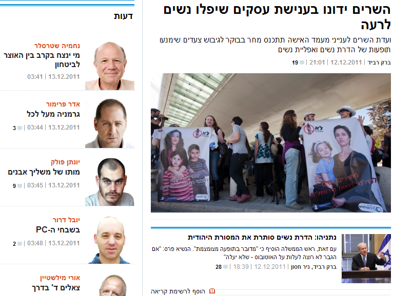 השרים החליטו על שורת צעדים שיימנעו הדרת נשים (וואלה!) הוקם צוות בין משרדי לטיפול בהדרת נשים מהמרחב הציבורי (ynet)